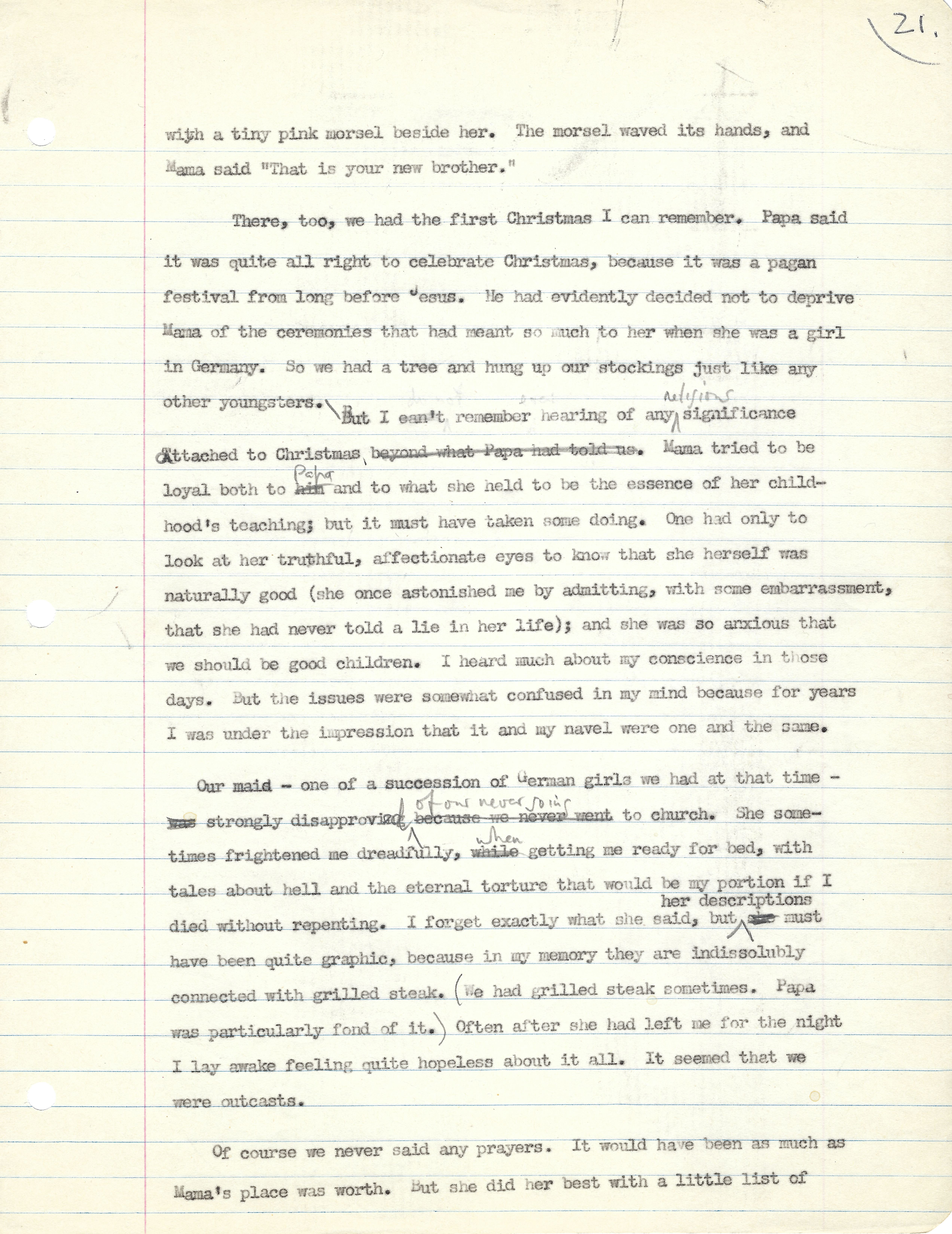 The English-born child of a militant-atheist American father and a tactfully devout German Lutheran mother, Rebecca Clarke enjoyed—shall we say?—an interesting mix of holiday traditions, with the tree, the candles, the stockings, and the tangerines grandfathered in as pre-Jesus paganisms. Here’s Clarke’s account of the family’s demi-Victorian-cum-Ethical-Culture Christmas in Harrow, possibly as early as 1892, when she was six years old. Given the maid’s behavior, it may have been a merciful deliverance that, Christmas apart, the Clarke children were “raised in the strictest irreligion.”
