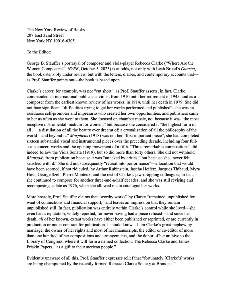 Clearly, this required a response, so we contacted the Review immediately with the relevant facts. This yielded a slight correction, deleting “and the unpublished pieces brought into print” from the body of the review, and adding a blink-and-you’ll-miss-it line at the end, reading “An earlier version of this article misstated the purpose of the Rebecca Clarke Society at Brandeis.” Well, no, actually—both versions of the article misstated the facts of the matter across the board, so we submitted a formal letter to the editor, and were told that it had gone to the relevant department for consideration. A month of near-silence passed, followed by a month of absolute silence, followed—after one final query on our part, just this morning—by news that space could not be found.