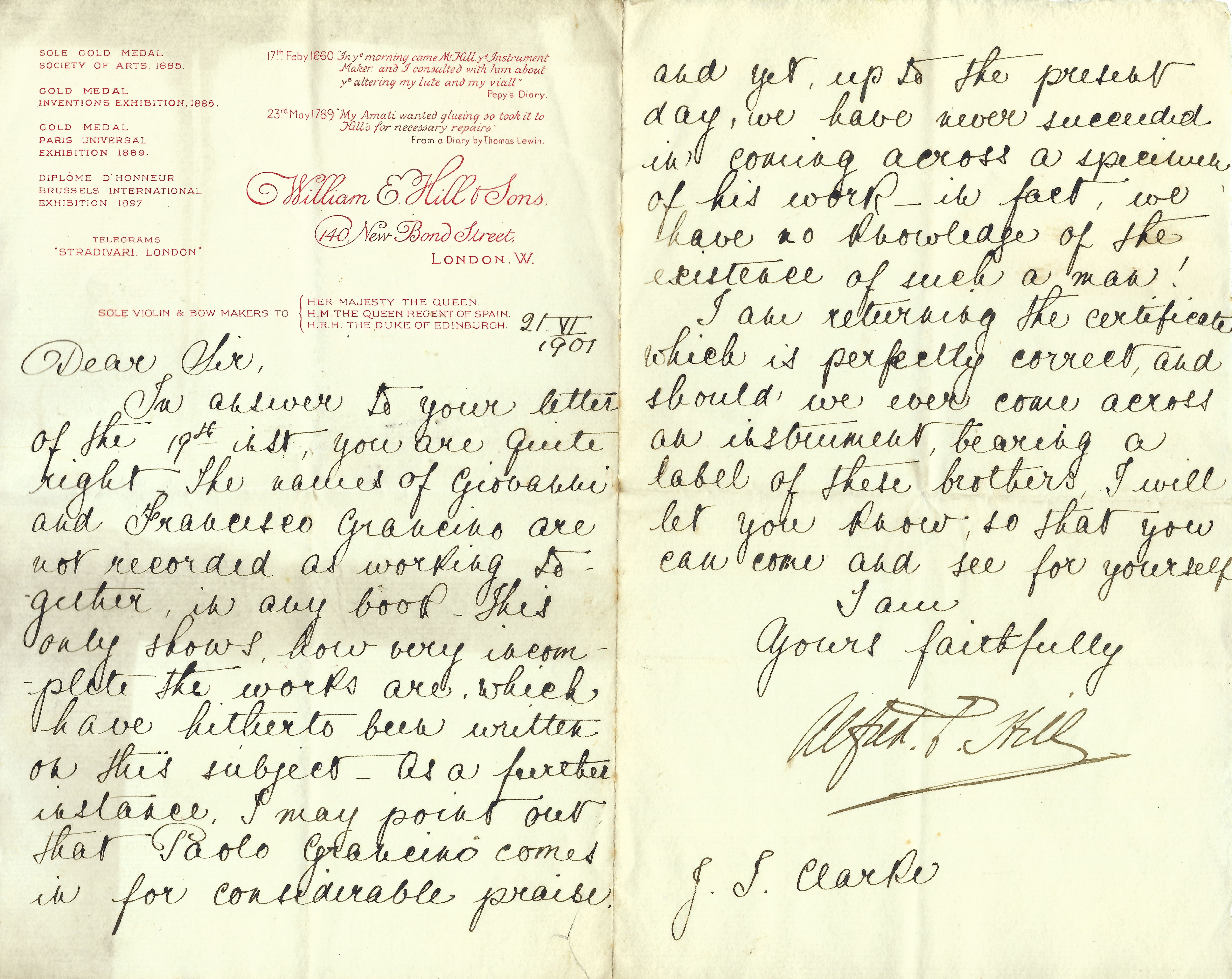 Throughout her career, Clarke played a Grancino that her father bought in Italy for £40, thinking it was an Amati. Hill & Sons, the preëminent London dealer, disagreed. Papa quibbled, but Hill’s better judgment—and cooler heads—prevailed.